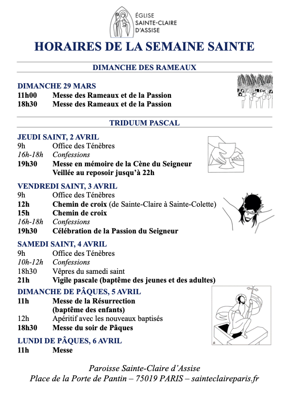 Soyez les bienvenus sur le site internet de la paroisse Sainte Claire d’Assise, église catholique du diocèse de Paris.