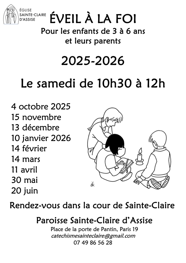 L’éveil à la foi a lieu une fois par mois le samedi de 10h30 à 12h.